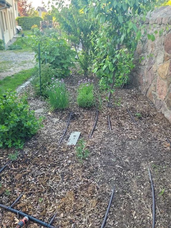 "Wir haben einen sehr kleinen verwinkelten Garten mit Terrasse und neben vielen Pflanzen in Töpfen auch einige Sträucher und etwas Gemüseanbaufläche. Die Einrichtung einer Tröpfchenbewässerung hatte ich mir unter diesen Gegebenheiten wirklich schwierig vorgestellt. Aber durch geschickte Organisation der Wasserkreisläufe, die Martin in Absprache mit uns bedarfsgerecht umgesetzt hat, kann nun alles wassersparend bewässert werden. Vielen Dank dafür!"